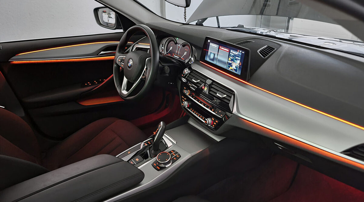 Transforma el interior de tu BMW Serie 5 G30/G31 con nuestra avanzada iluminación ambiental multicolor. Este sistema te permite seleccionar entre 64 tonalidades diferentes, adaptando el ambiente de tu vehículo a tu estado de ánimo o preferencia personal. La integración completa con el sistema iDrive de BMW garantiza un control sencillo e intuitivo, permitiéndote ajustar colores y brillo directamente desde la pantalla del coche.