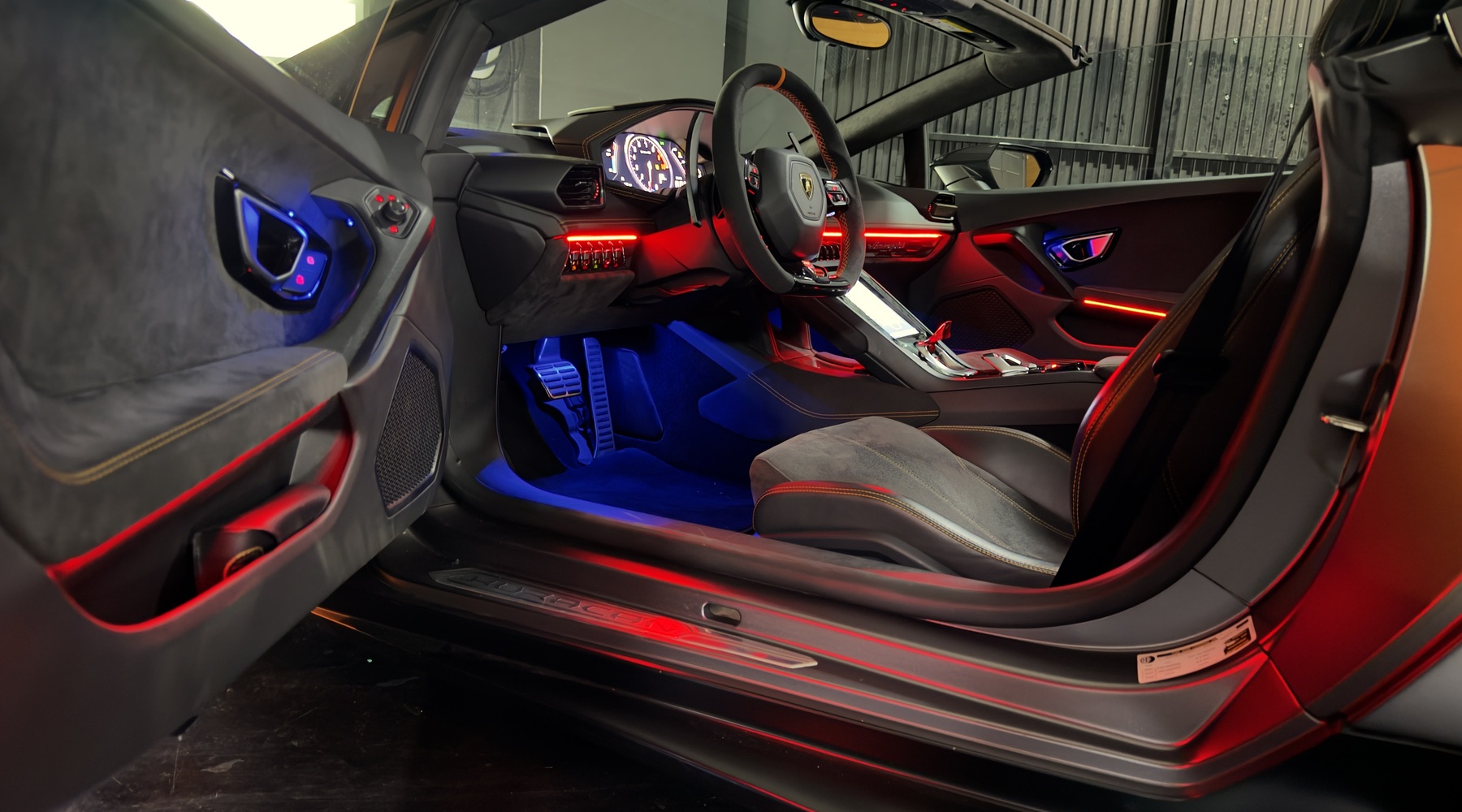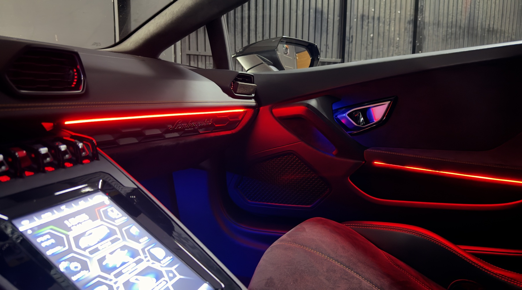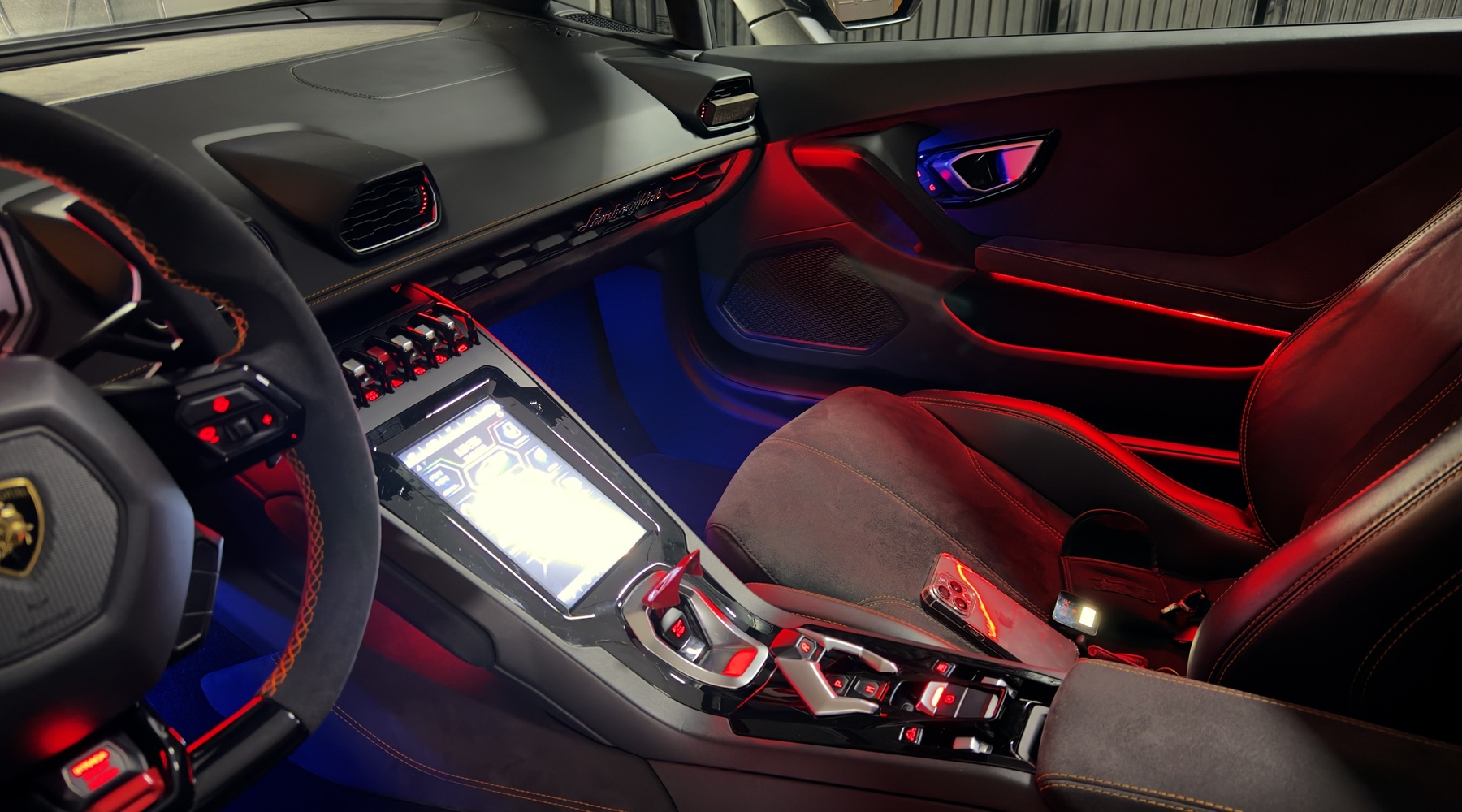 Personaliza el interior de tu Lamborghini Huracán con un sistema completo de iluminación ambiental premium, instalado en salpicadero, consola central, puertas y reposapiés.