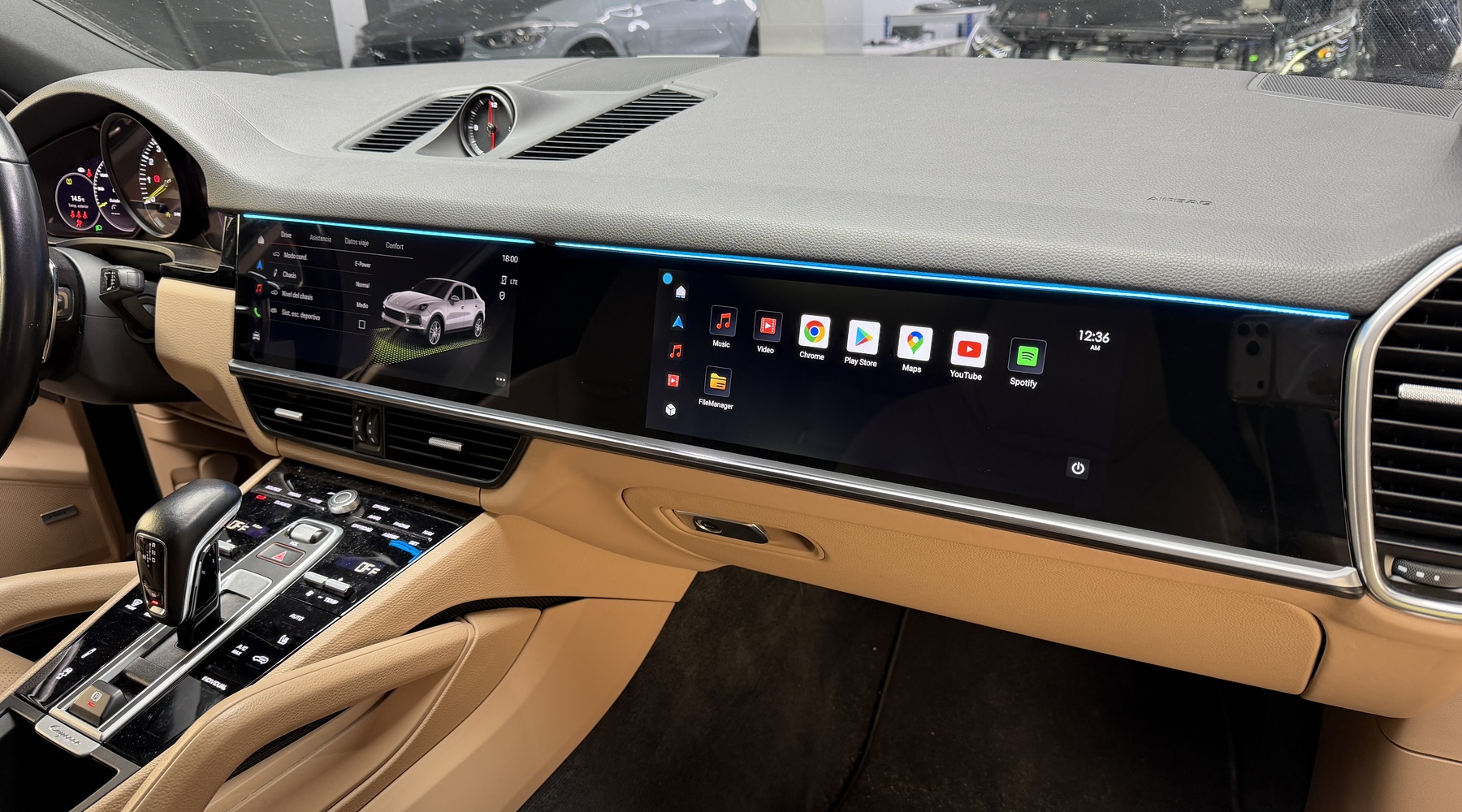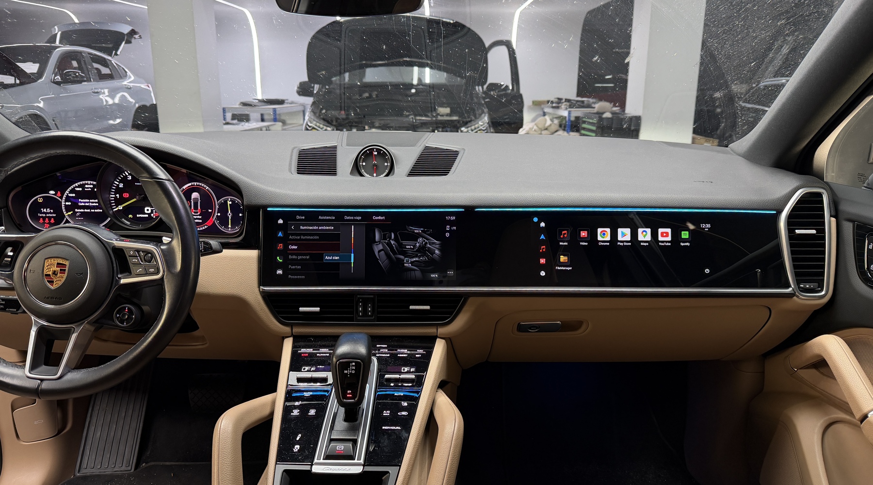 Transforma el salpicadero de tu Porsche Cayenne (2017–2024) con nuestro sistema pantalla dual integrada, un upgrade visual que añade una segunda pantalla alineada a la original, extendiendo la superficie digital hasta la zona del pasajero. El resultado: un diseño completamente renovado, tecnológico y elegante, sin perder la esencia original del vehículo.